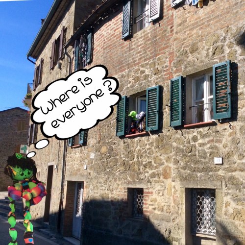 Then they drive through the beautiful Umbrian countryside and up a winding mountain road to a pretty medieval village. The houses, the trees and the fields all look very strange to Georgie. Everything is so different from England.