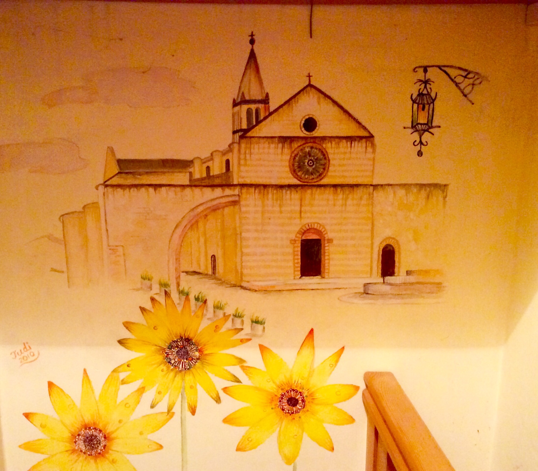 Georgie enjoyed the drive to Assisi very much. The roads were very quiet and weaved in and out between fields and olive groves. At first the town was just a speck of white on the hillside and then, as they drew nearer Georgie couid see the pale pinky white stone houses and the magnificent Basilica of St. Francis.