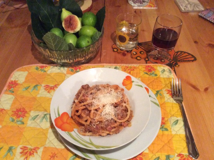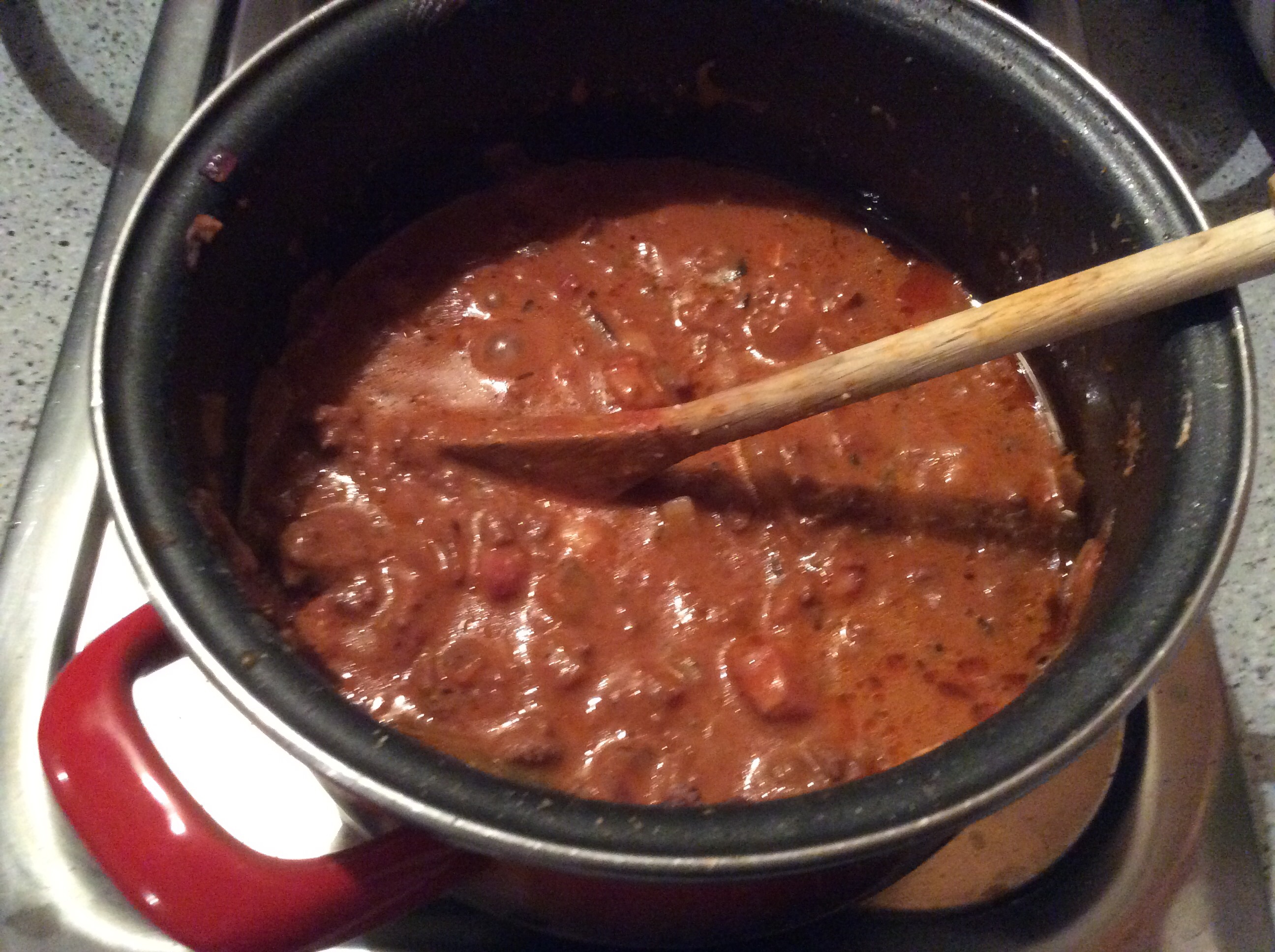 Put on lid and simmer gently for forty minutes. Keep checking. If it is going dry add more passata