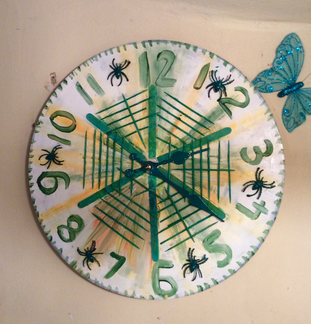 The web is made from long cocktail sticks and lolly sticks and the spiders are plastic ones I painted emerald green with nail varnish.