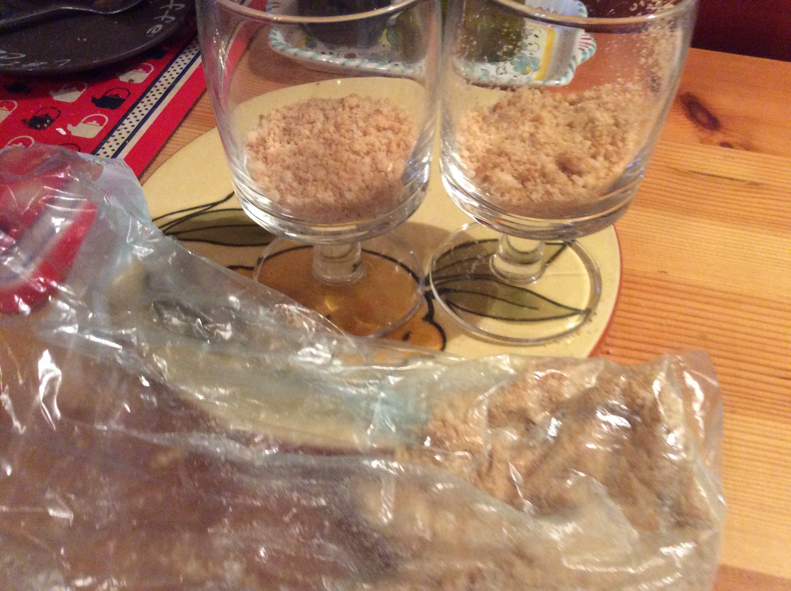 First crush the biscuits. 2/3 per person. I put them in a plastic bag and beat them with a rolling pin. Then put a thin layer of the biscuit crumbs at the bottom of the glasses.