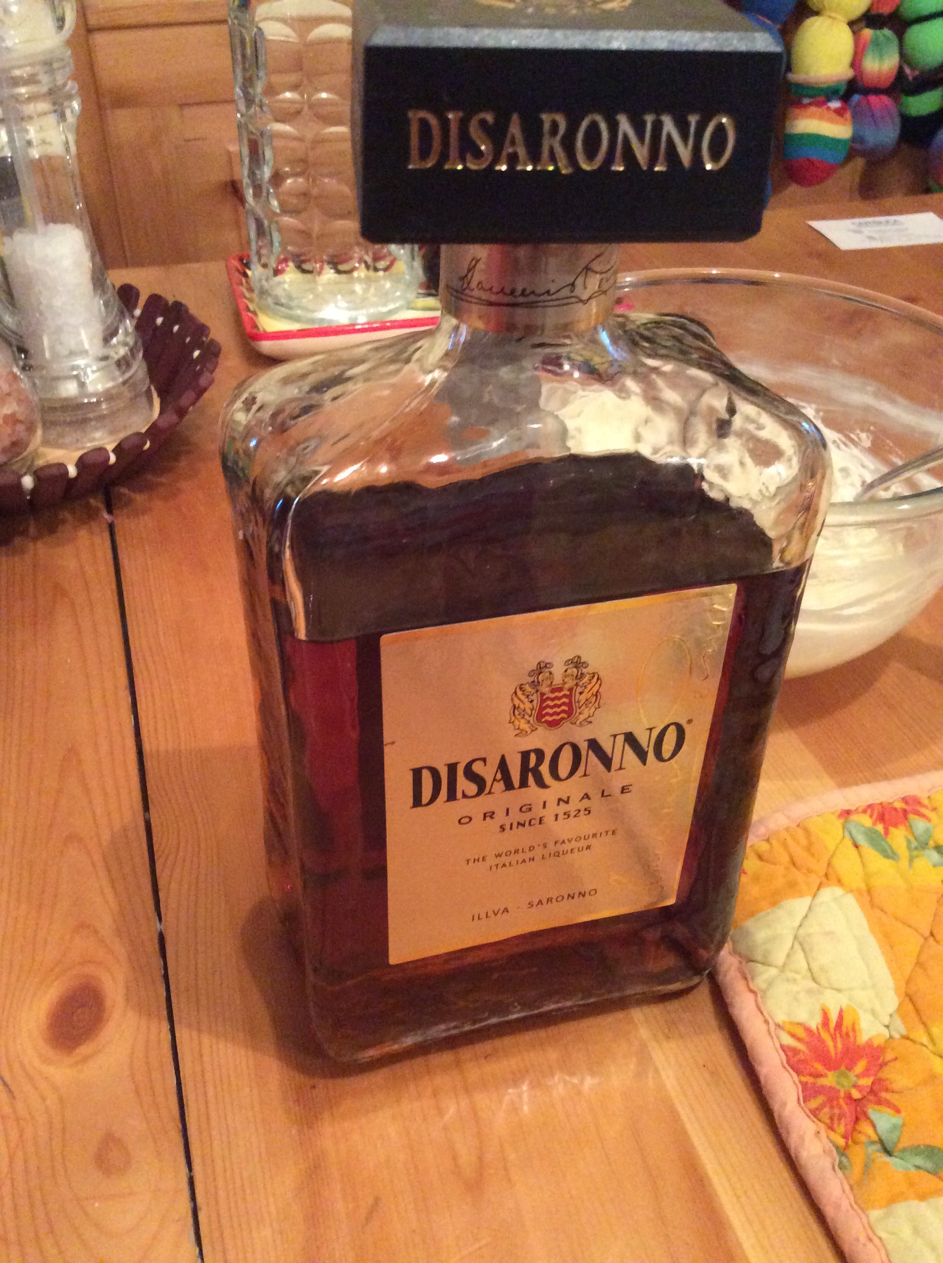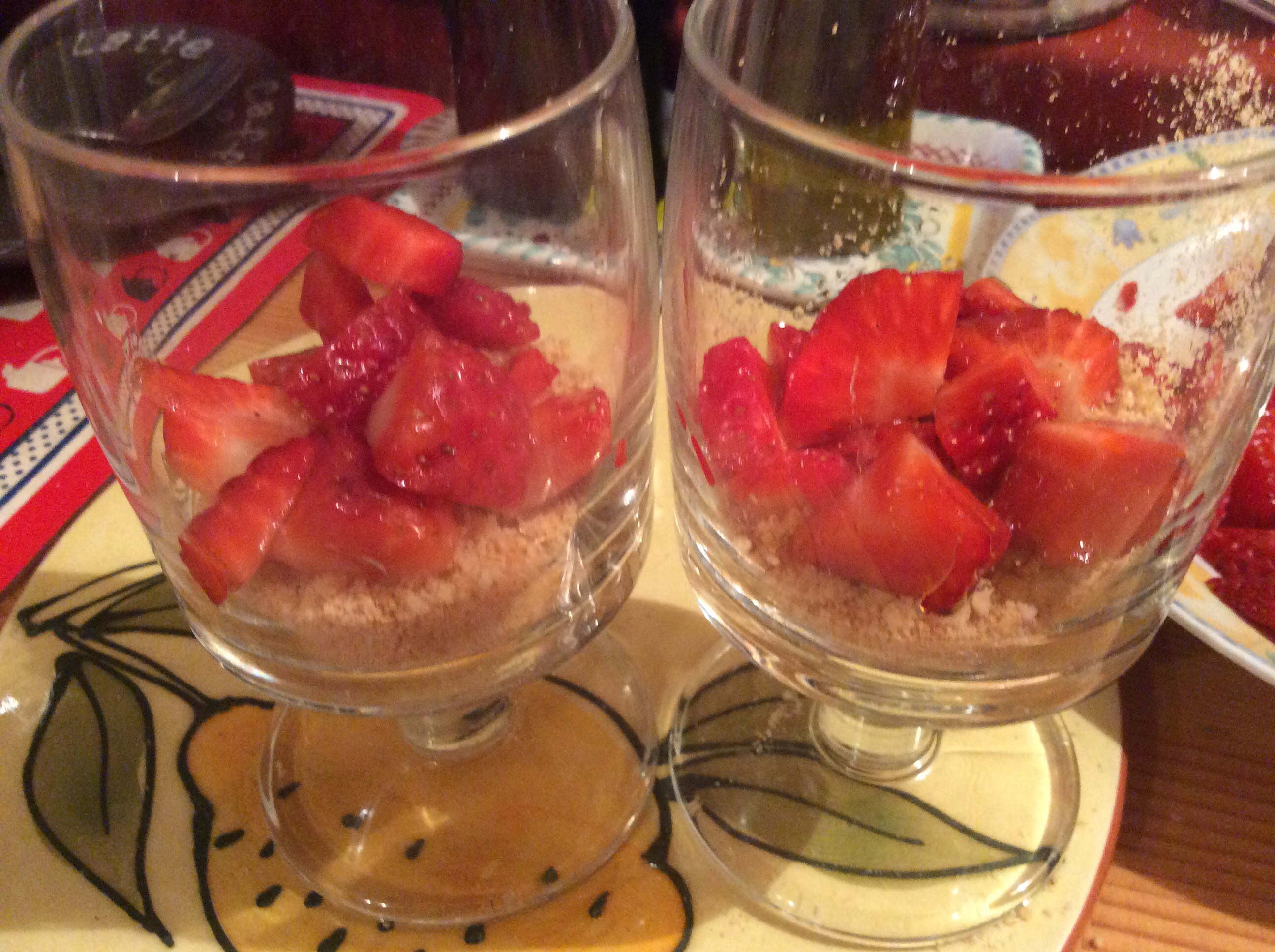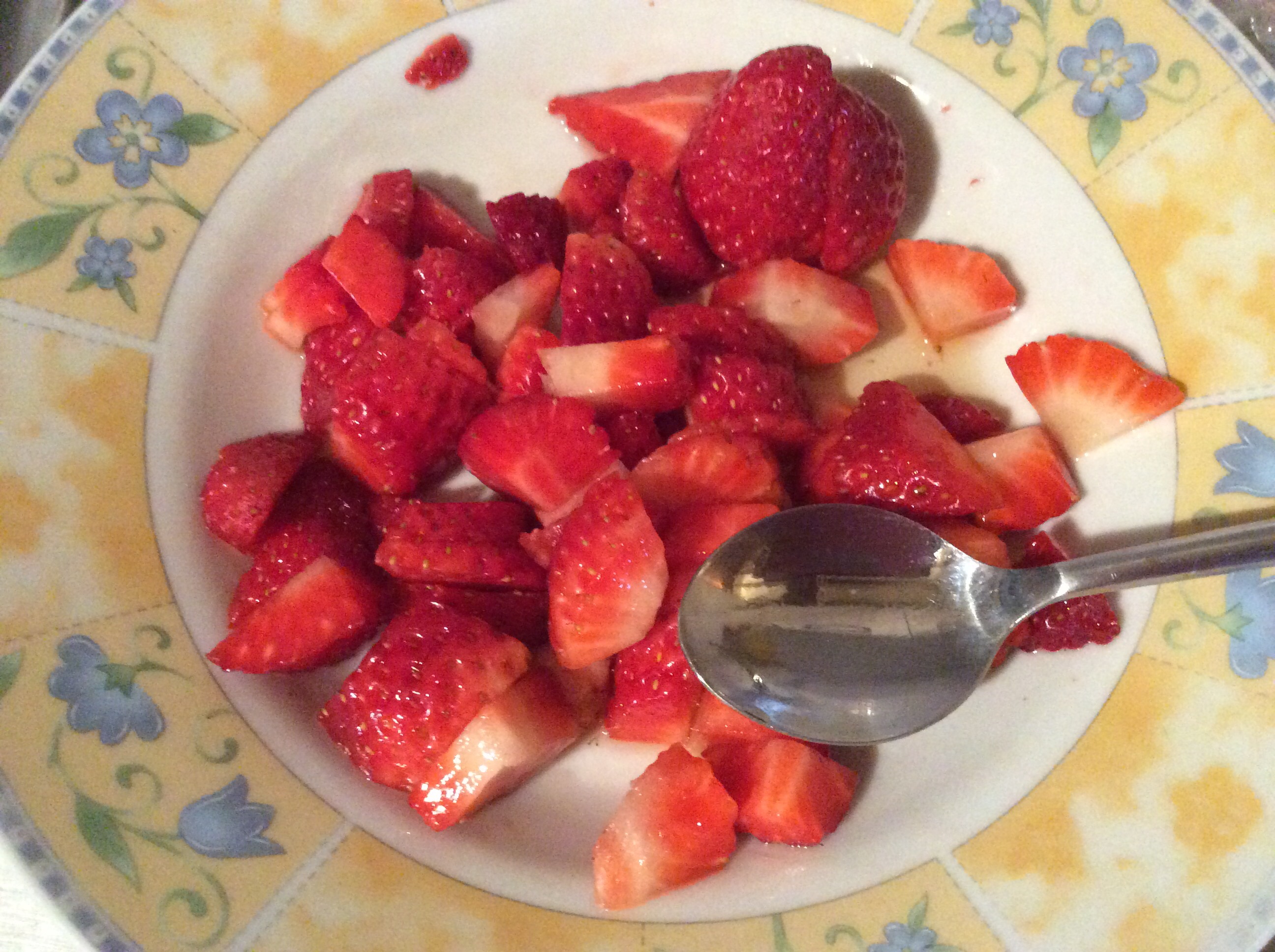 Chop the strawberries into bite sized pieces and soak in Di Saronno for half an hour. I used one tablespoon per person. If you are using berries or frozen fruits of the forest do the same..