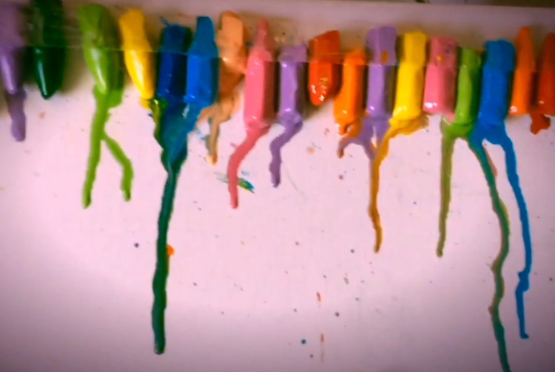 The idea is to keep the hairdryer pointing downwards onto the crayon. Tilt the board slightly.  When the crayon first starts to melt it sprays a little in all directions and then will start to trickle downwards .  Once there is a stream of each colour then the fun begins!  The board can be tilted in different directions so causing the colour  streams to cross and mix.