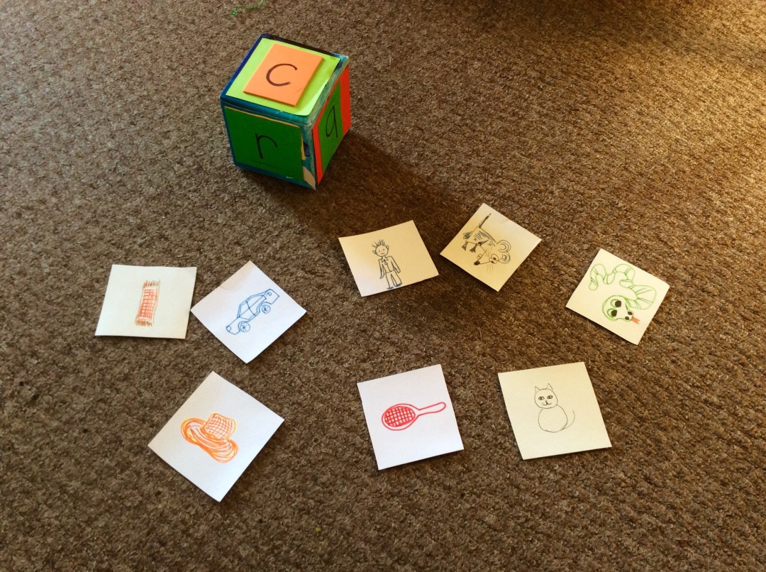 Then let the child draw his/her own pictures on pieces of card .  Try to choose objects with short, 3 letter names. For example for the letter C there could be pictures of a cat and a car.  For m pictures of a man and a mat etc.