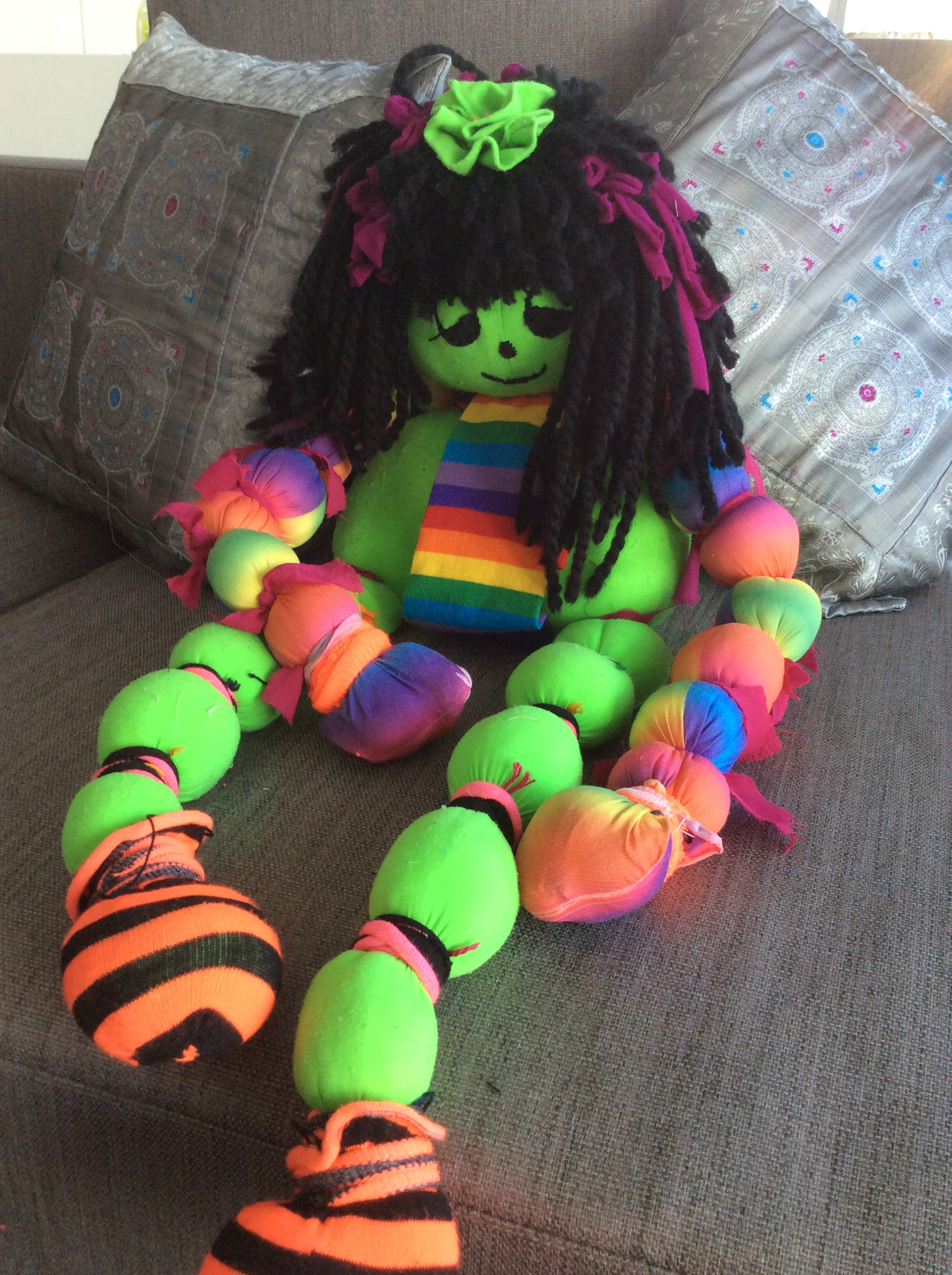 The web is made from long cocktail sticks and lolly sticks and the spiders are plastic ones I painted emerald green with nail varnish.